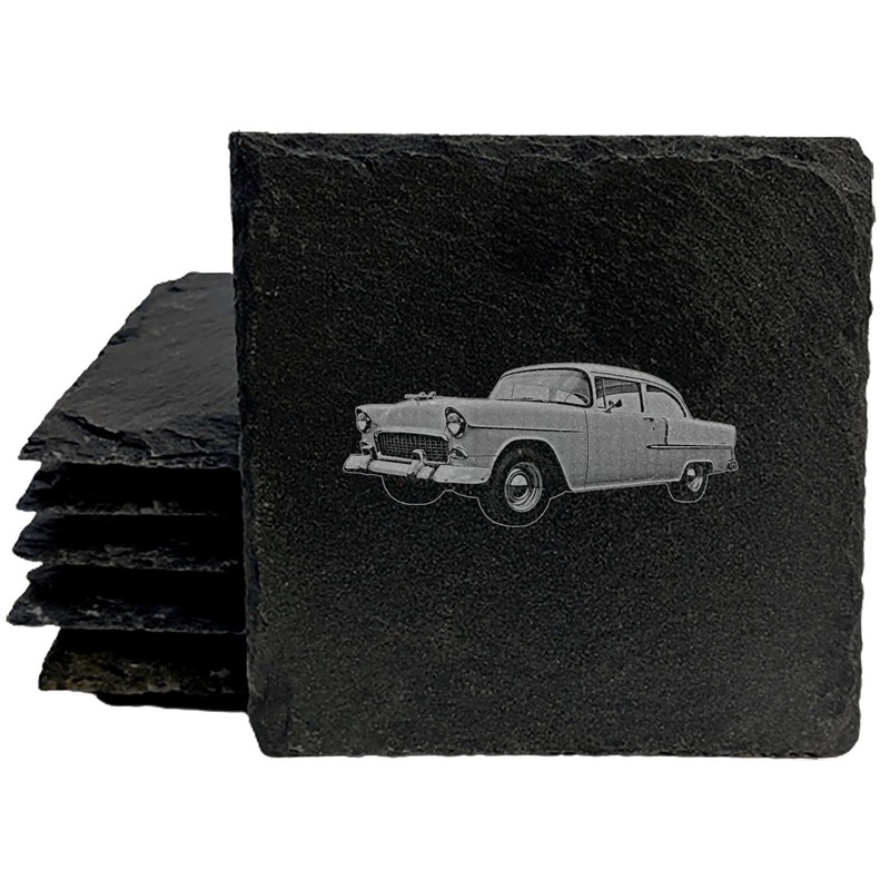 Own a piece of automotive history with these one-of-a-kind slate coasters, featuring a stunning laser-etched image of a legendary 1955 Chevrolet Bel Air.