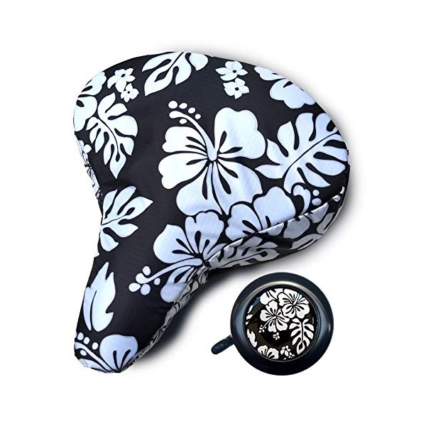 Cruiser Candy Cushioned Padded Waterproof Adjustable Fun Bike Bicycle Seat Cover, Beach Cruiser SEAT Cover, Matching Bike Bell, Cute Beach Cruiser Bicycle Bell Free (Black White Hibiscus)