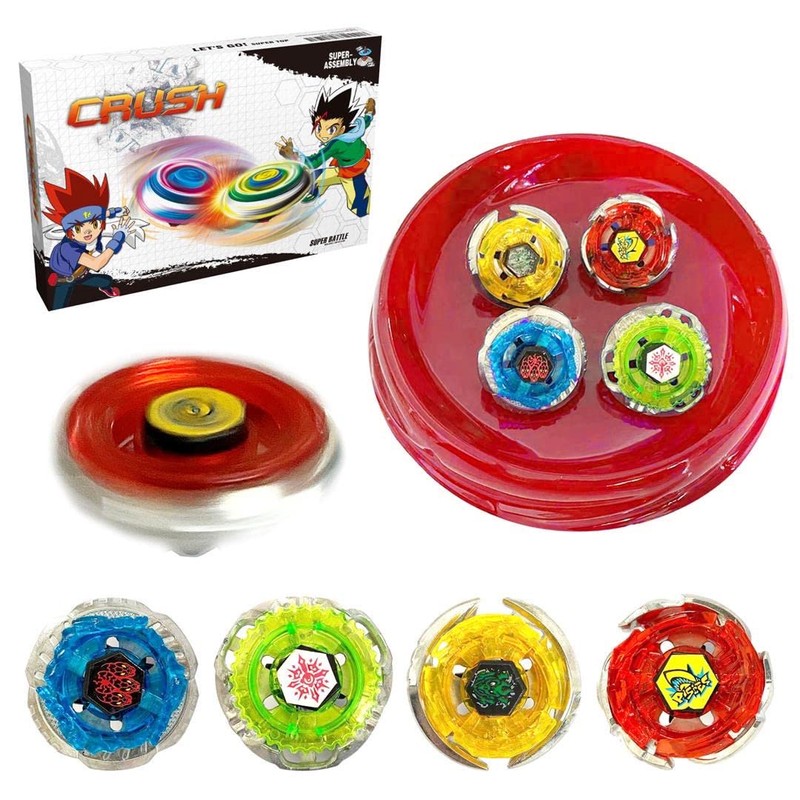 - COLORS AND TOPS ARE RANDOM: Engineer the right performance. Then, set it up on its launcher, pull the ripcord and send it spinning into action. Super Value Set. This is a Crush product, Not Takara, Tomy or Hasbro. Tops include facebolt, energy ring, fusion wheel, spin track and performance tip pieces and comes with ripcord launcher and assembly tool. 4-piece top lets you customize the right combination for attack, defense and battle stamina. Battle it out in any stadium arena.