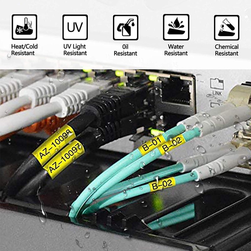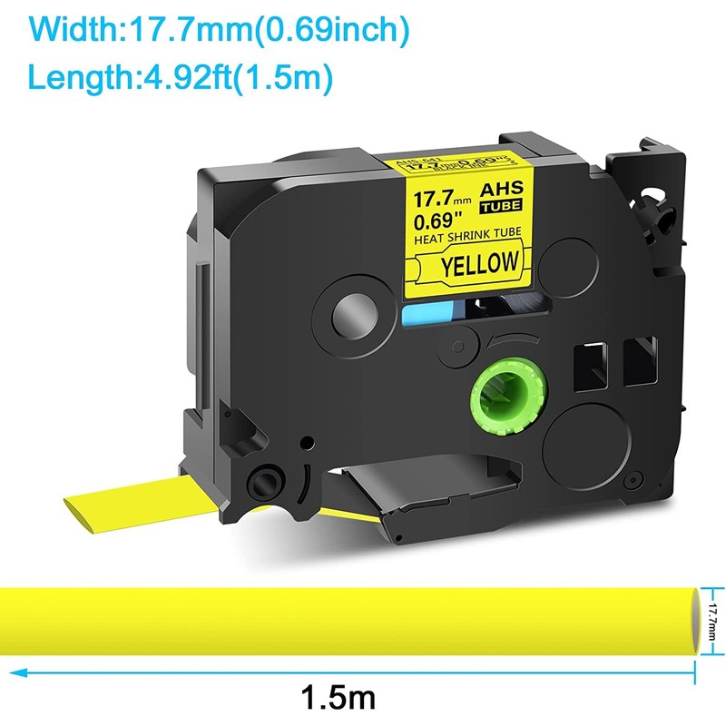 - Size & Color & Features: Width of Tapes: 0.69 in. (17.7mm); Length of Tapes: 4.92ft. (1.5m); Color of Tapes: Black Print On Yellow Tube. Feature of Tapes: Chemical and Water Resistant, Abrasion Resistant, Temperature Resistant, Fade Resistant.