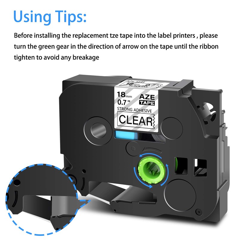 - Size & Color & Features: Width of Tapes: 18mm 0.7 inch (3/4"); Length of Tapes: 8m (26.2'); Color of Tapes: Black writing on clear tape. Feature of Tapes: Laminated, Extra Strength Adhensive, Chemical and Water Resistant, Abrasion Resistant, Temperature Resistant, Fade Resistant.