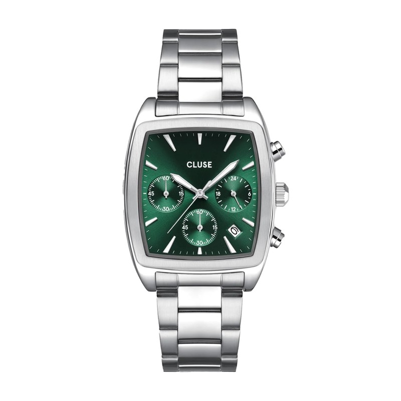 - The Quartaut Chrono watch combines strength and luxury. It features a sleek silver-tone tonneau case with a stainless steel 3-link strap and a green dial with three subdials. Comfort and style combine with perfect sculpting beauty