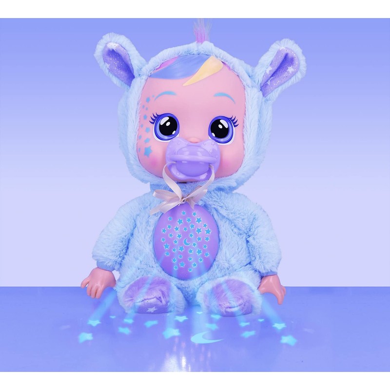 Sweet Dreams with Cry Babies Goodnight Starry Sky Jenna! Jenna wears a cuddly pegasus themed pajamas. She cries LED light up tears and makes 8 realistic baby sounds when you remove her pacifier. Give her a paci and she will stop crying! When your little ones press her belly, she will turn their bedroom into a magical starry night sky displaying a moon and lots of stars! She plays up to 10 minutes of 5 soothing lullabies. Jenna comes with a matching pacifier. Recommended age 18+ months.