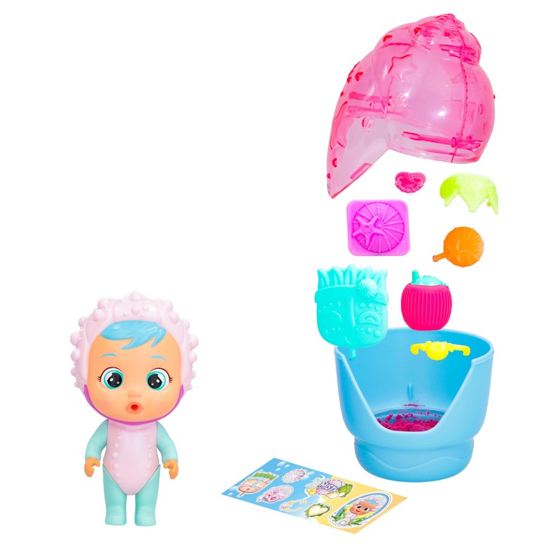 - Shell capsule: the small house from the Mini Cry Babies transforms into a beautiful beach shelter of the tropical world with many surprises inside