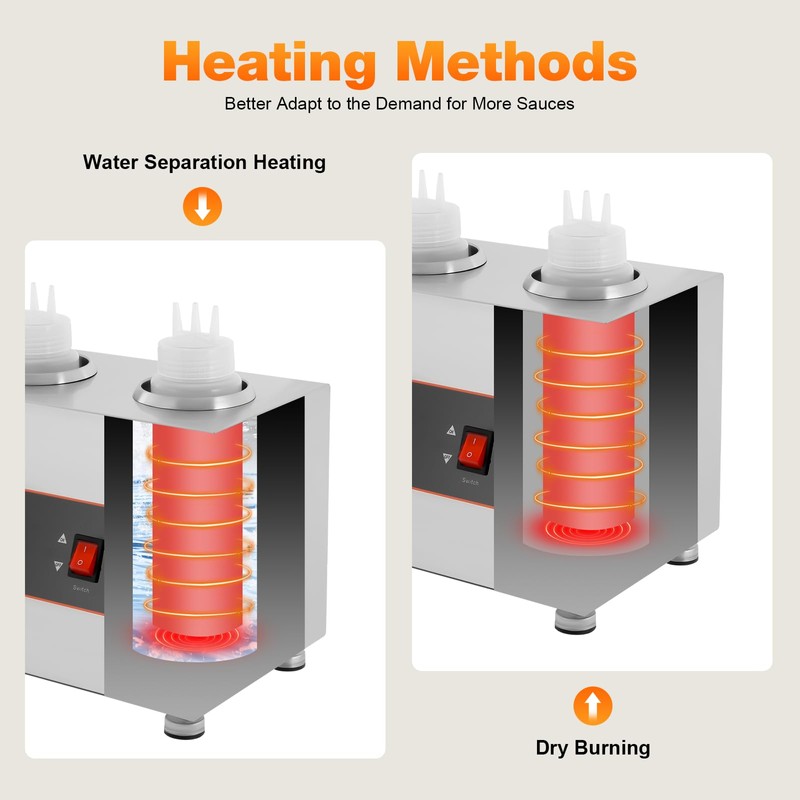 - EXCELLENT DESIGN: The hot cheese sauce warmer has two heating methods, water separation heating and dry burning. You can choose according to your needs and different sauces, convenient for your life. The sauce warmer comes with two bottles, the bottles are made of PC, heat-resistant and wear-resistant, you can use them without any worry. In addition, each bottle has a capacity of 650 ml/27.47 oz/0.14 gallon, so you can put enough sauce at one time.