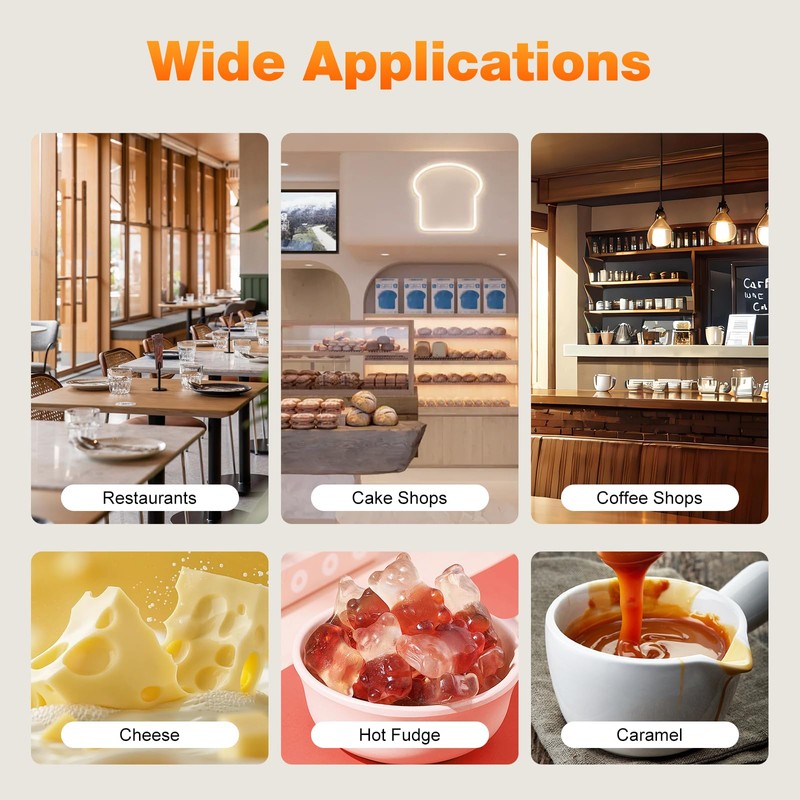 - HIGH QUALITY MATERIAL: Our chocolate sauce warmer is made of 201 stainless steel, safe, durable and rust-proof, no need to worry about causing harm to your body. This sauce warmer can be used to heat cheese, hot fudge, caramel, pepper, curry, chocolate butter cheese, sauces and so on. In addition, the chocolate sauce warmer can be widely used in hotels, restaurants, cake stores, pastry stores, coffee shops, artisanal chocolate stores, snack chain stores, cold drink stores and so on.