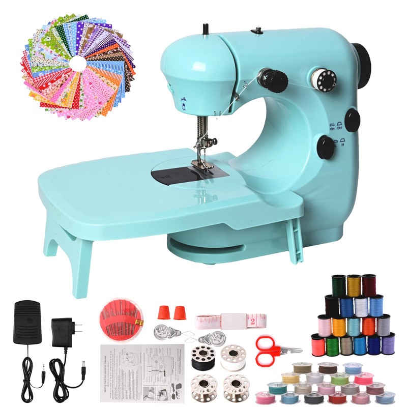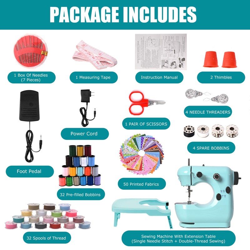 - Complete Accessory Kit Our adults and kids sewing machine comes with a comprehensive 127-piece accessory kit,including 50 printed fabrics,1 box Of needles,32 spools of thread ,32 pre-filled bobbins,4 bobbins, measuring tape, scissors, thimble, needle threader, power adapter, foot deal,and instructions.Never worry about missing sewing accessories again.