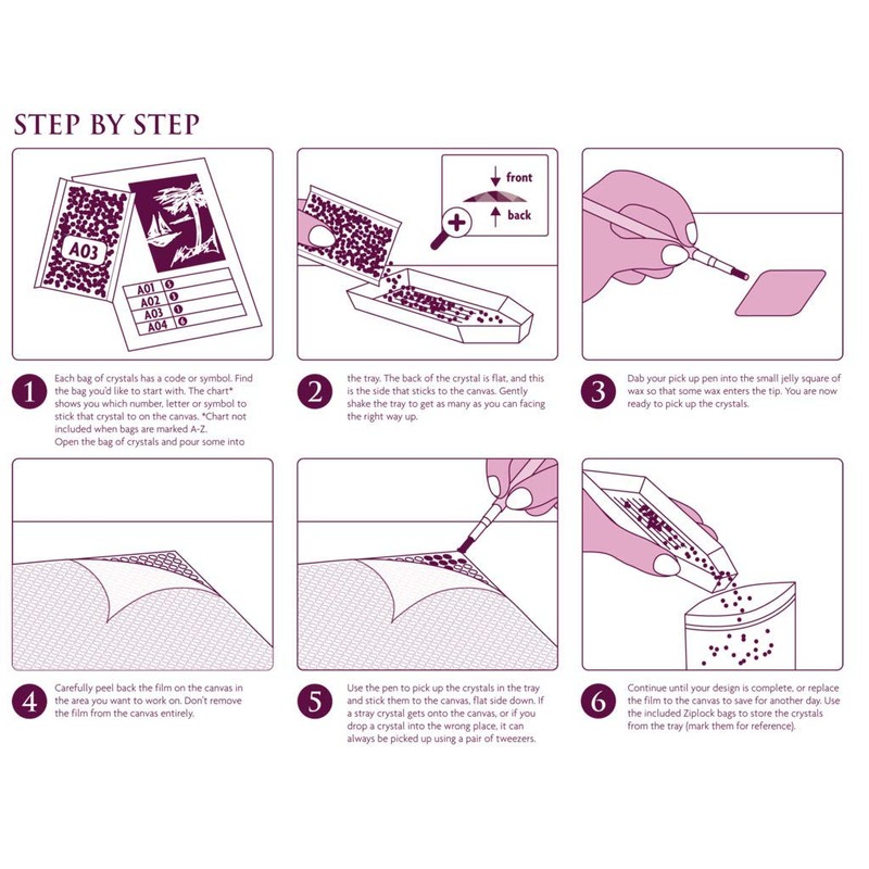 - Each Crystal Art kit includes a coded adhesive design template, Double-sided crystal pick-up pen, Jelly wax, Coded pre-sorted crystal packets, Grooved crystal tray, Plastic storage bags, Instructions.