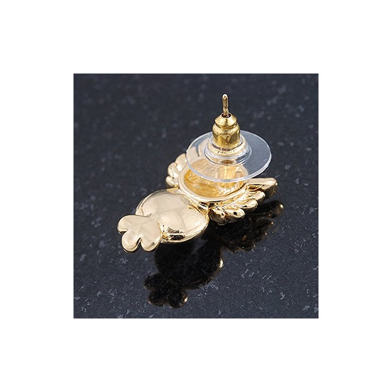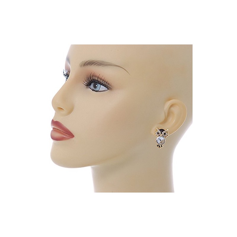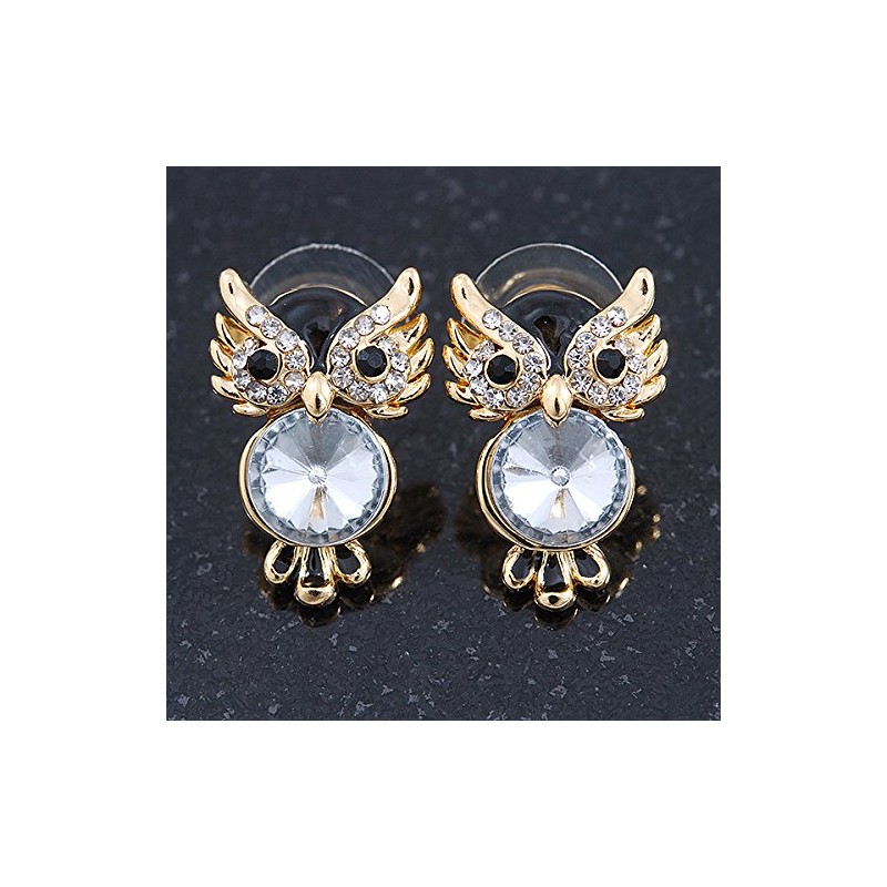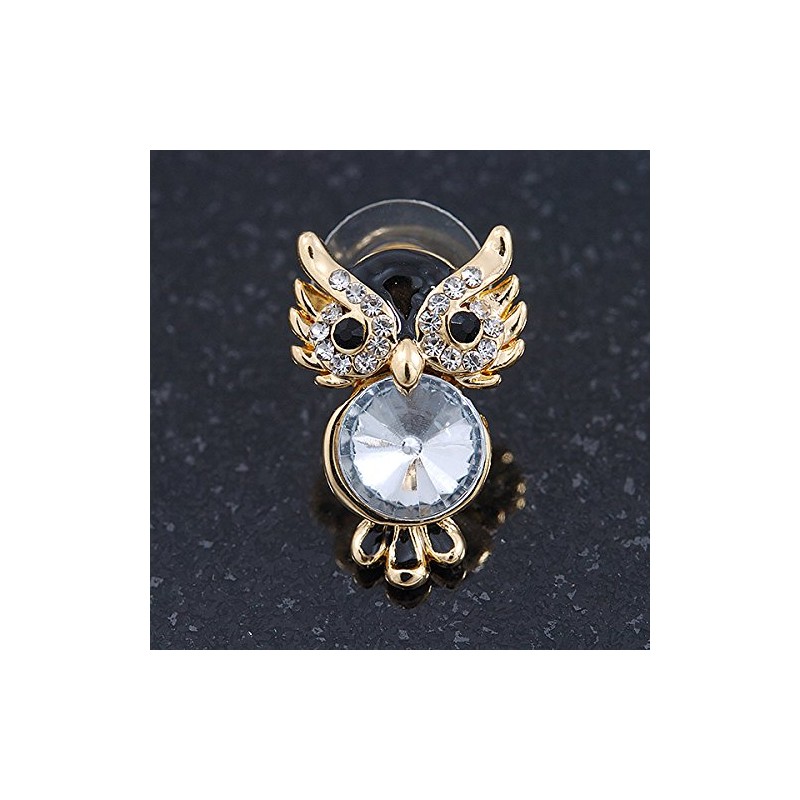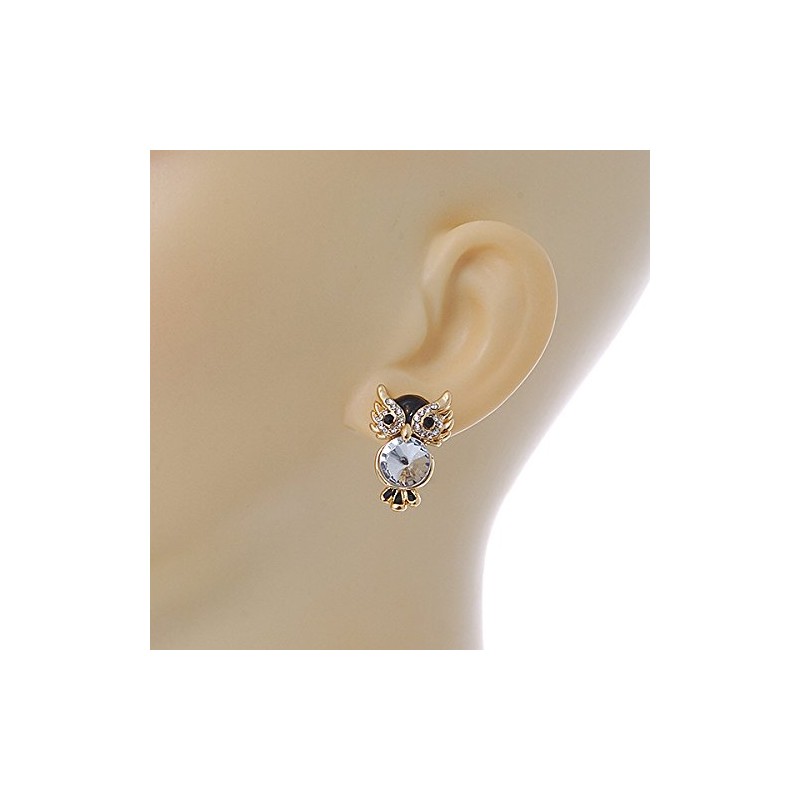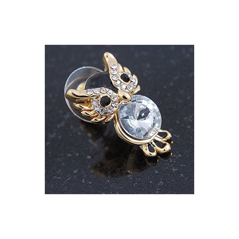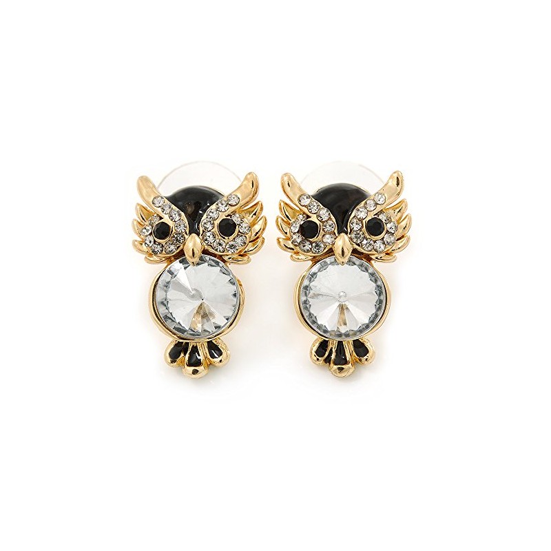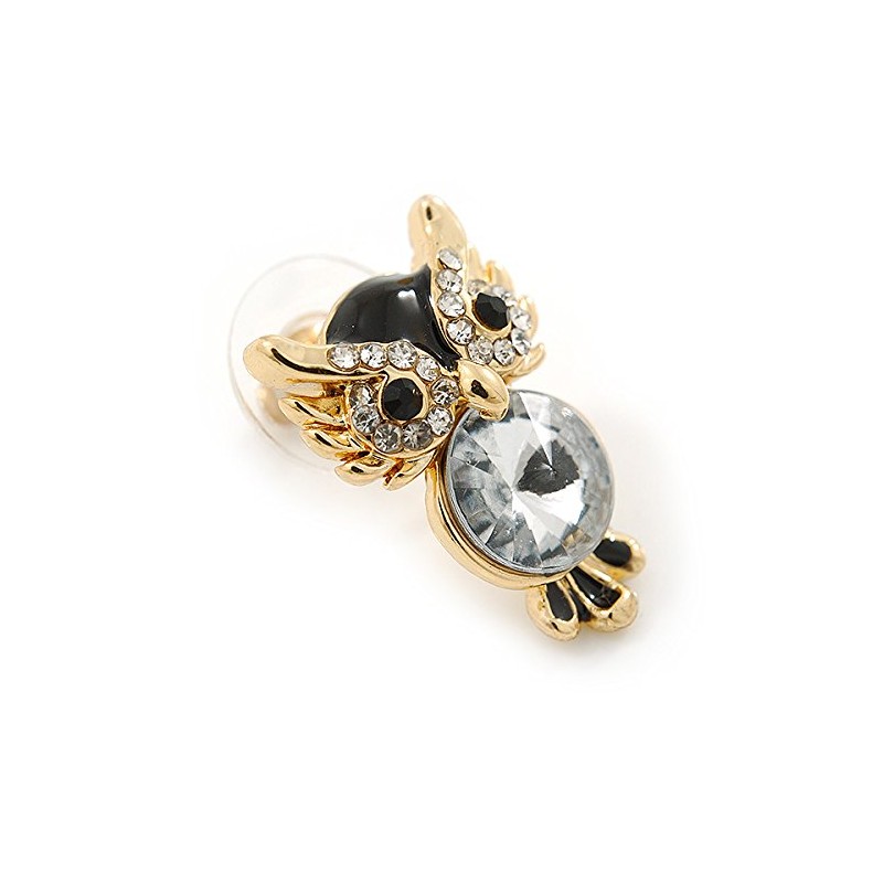 Crystal, Black Enamel Owl Stud Earrings In Gold Plating - 20mm L