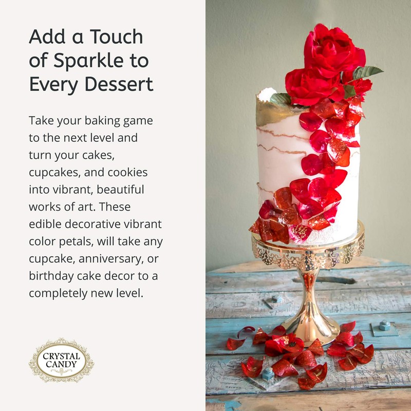 - IDEAL FOR ANY BAKING PROJECT & MORE: Make colorful tropical flower cake decorations, add fun to your kid's holiday party, or thrill your sweetheart on Valentine's with homemade desserts decorated with Crystal Candy Edible Petals. A few peices of these beautiful edible decorative petals on the toppings of your cakes, desserts or any other baked goods, is what you need to make all your guests go “WOW”!