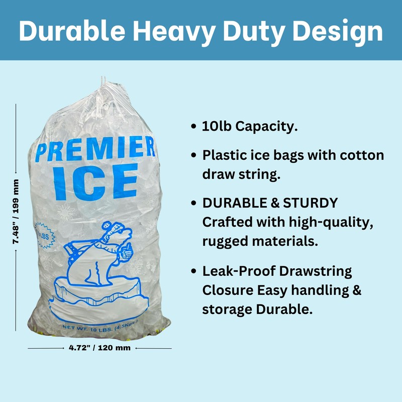- SECURE CLOSURE: The intelligently designed drawstring closure not only provides a tight and leak-resistant seal but also offers added peace of mind. The convenient plastic drawstring on our bags for ice ensures a tight and secure closure, preventing any accidental spills or leaks during transportation or storage.
