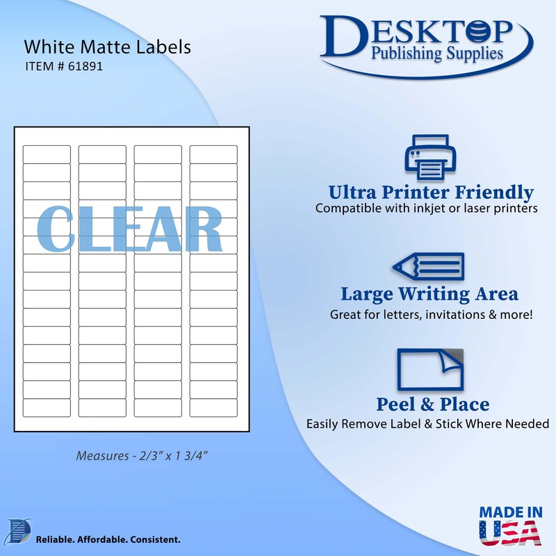 Desktop Publishing Supplies Brand Laser Crystal Clear Labels for Laser Printers. Our Crystal Clear Labels are see through like glass- they DO NOT feature a frosted look to them. Label size is 2/3" x 1 3/4"