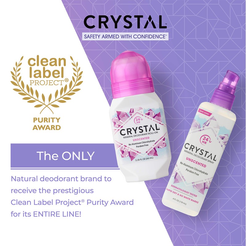 - CRYSTAL CLEAR INGREDIENTS: Crystal is the only deodorant brand to receive Clean Label Project Purity Award for ALL of our deodorants. We never use aluminum?chloride, parabens, sulfates, phthalates artificial fragrances, or colors.