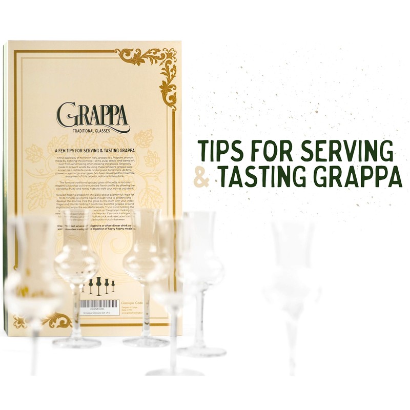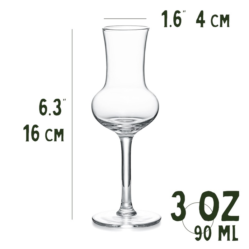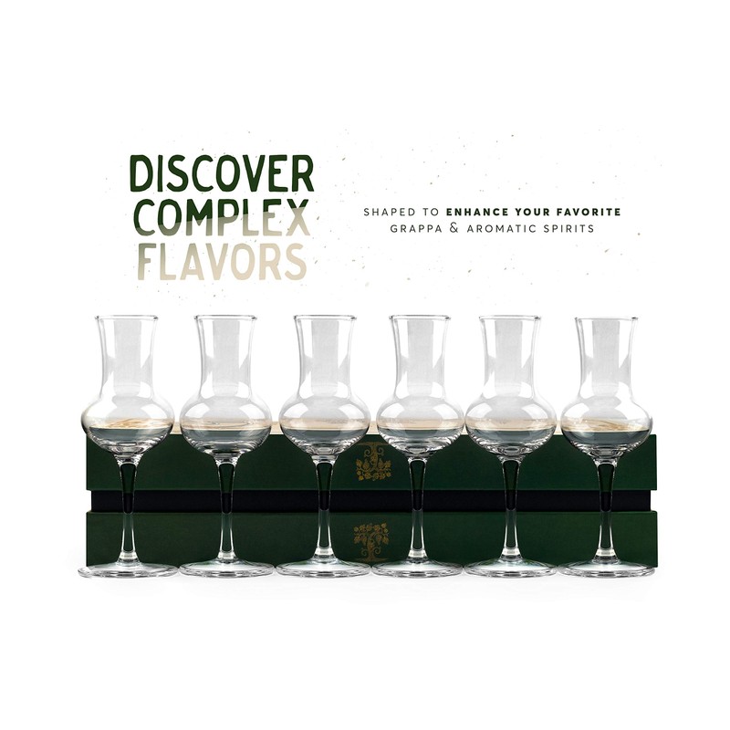 - DISCOVER COMPLEX FLAVORS – traditionally shaped into rounded bowls that cinch like an hourglass before flaring out at the top, these classic Italian grappino glasses maximize the nuanced grappa flavor profile. The wide opening allows the sharp alcohol vapors to disperse away while the tulip bulb concentrates its lush olfactory notes before delivering them towards your nose for ultimate nosing and sipping experience.