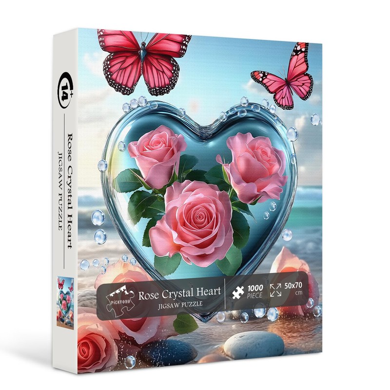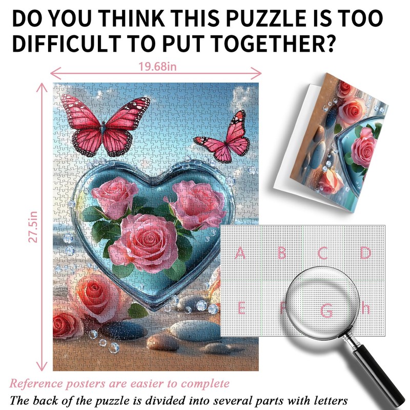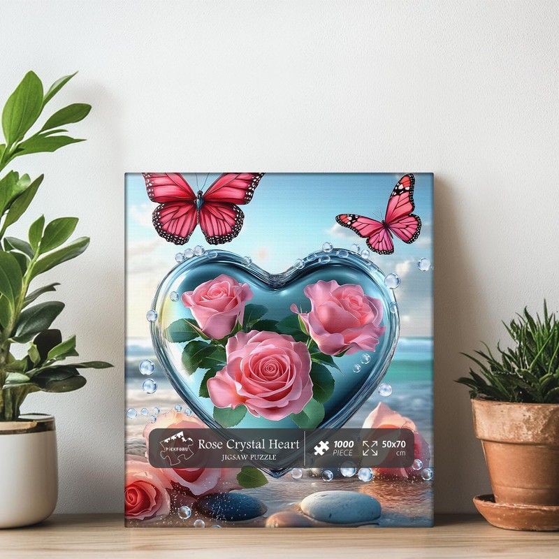 Crystal Heart Puzzles for Adults 1000 Pieces, PICKFORU Summer Beach Flower Puzzles for Adults Butterfly, Impossible Rose Love Theme as Wall Decor