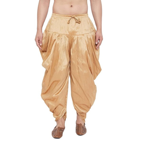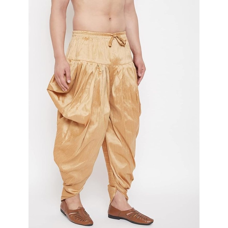 CRYSTAL REVENUE Men's Readymade Elastic Cotton Silk Dhoti for men, Free Size, Pre-Stitched, Ready-to-wear- Gents Dhoti, Matche with Kurta Pack Of 1., Golden, Free