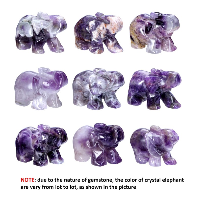 - SPECIFICATIONS: 1.45-1.65 inches in length, 1.06-1.30 inches in height,0.67-0.79 inches in width; Material: natural amethyst crystal stone; Weight: 20g; Package: 1x crystal elephant, 1x gift box; NOTE: due to the crystal elephant figurine is made of nature quartz crystal gemstone, carving may slightly vary in size, color and shape