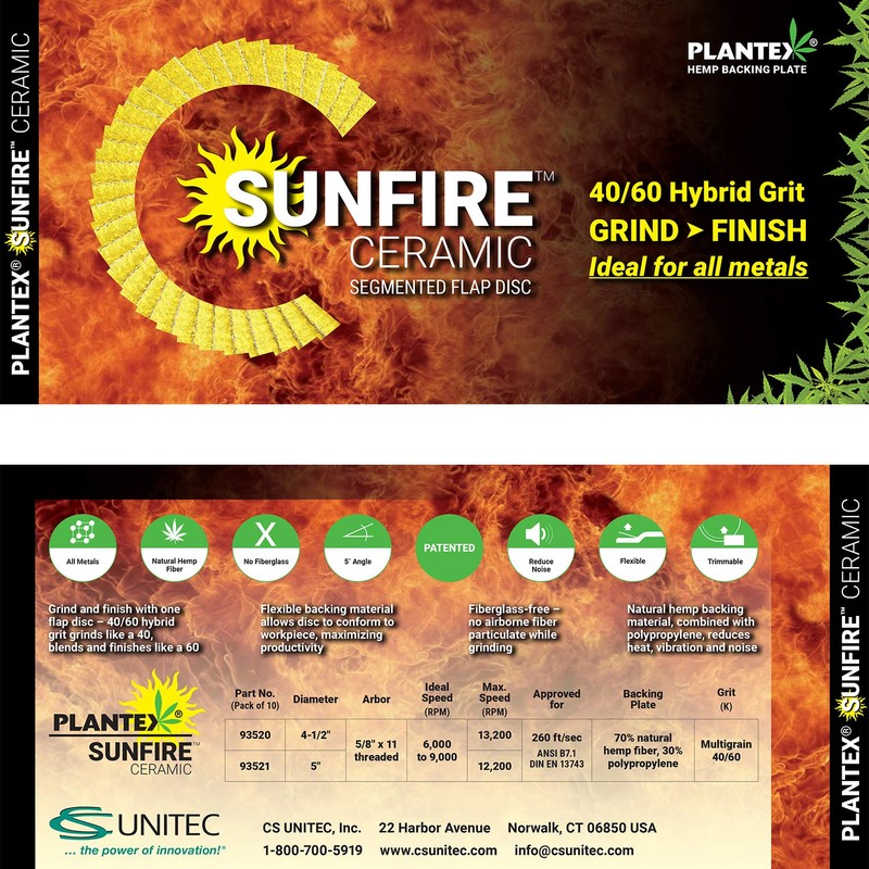 CS Unitec | PLANTEX SUNFIRE Ceramic Timmable Flap Disc | Hybrid 40/60 Grit | 5" Dia, 5/8-11 Hub | Type 29 | Made in Germany | 10 Pack