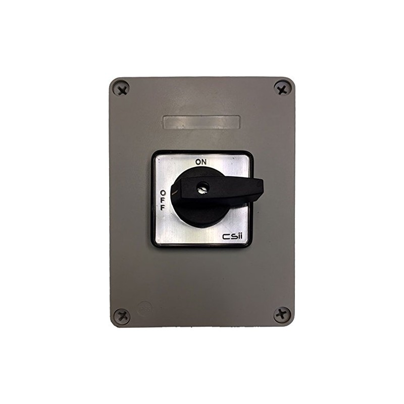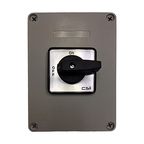 - Complete 3 pole OFF/ON switch mounted in an ABS enclosure. No padlock.Comes with silver legend/black handle.