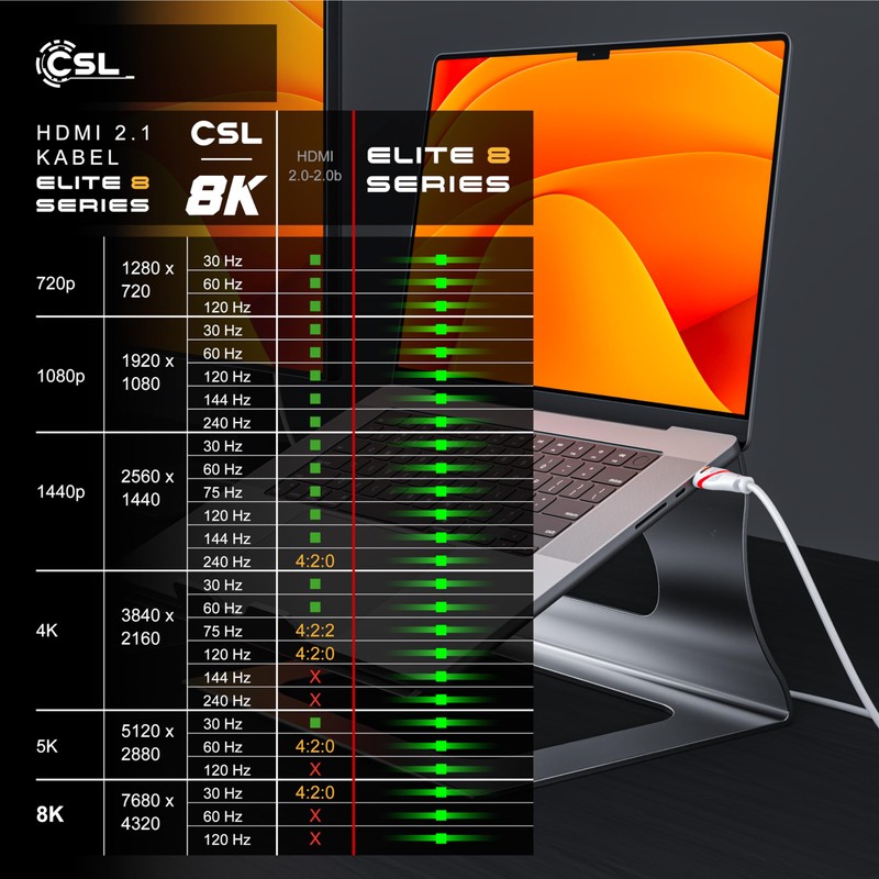 The CSL Premium 8k UHD II HDMI cable is 3D capable and supports all resolutions from 8K downwards