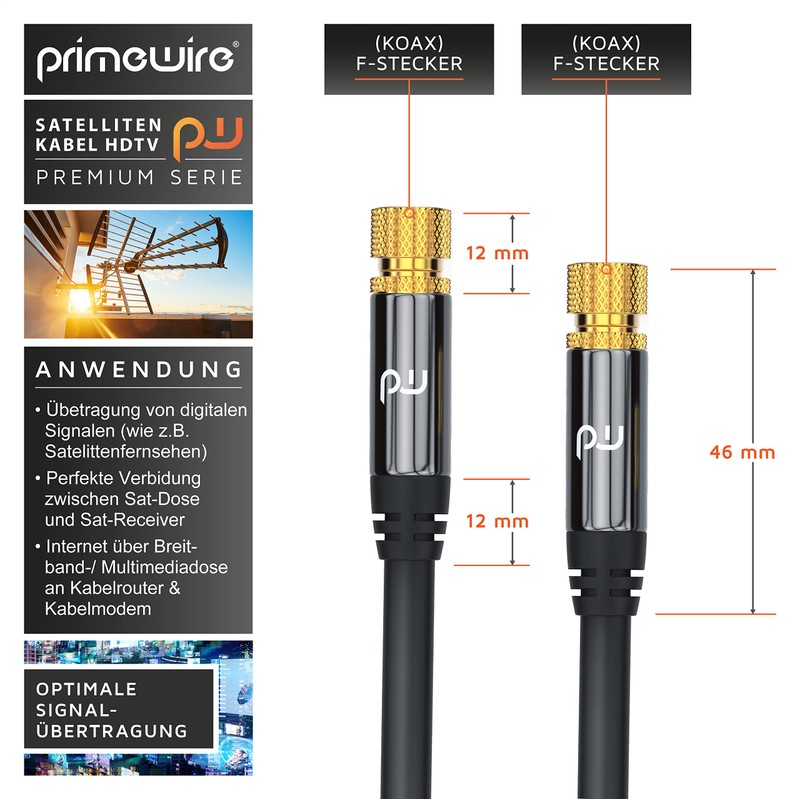 - Model name: Primewire 7.5 m premium TV satellite cable / F-plug (male) to F-plug (male) | transmission of analogue and digital signals as well as DVB-S, DVB-S2 and cable internet | provides a reliable connection between the connection/multimedia socket and the receiver device such as TV/satellite receiver/cable modem/cable router. | 302886