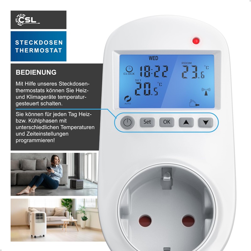 CSL Plug Thermostat, Sockets, Digital Temperature Controller: Heating Thermostat with NTC Probe for Heating, Heaters, Air Conditioners, Infrared Heating
