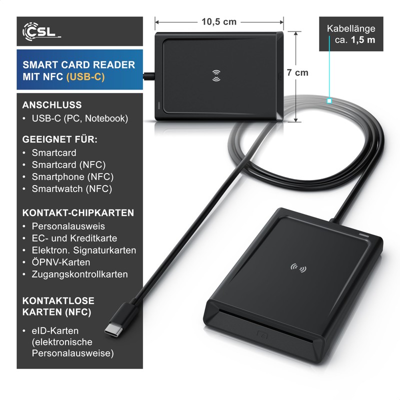 - Dimensions (length x width x height): 10.5 x 7 x 1.5 cm. Length of the USB cable: approx. 1.5 m. Weight: 80 g. Operation on USB port type C. Box contents: CSL USB SmartCard Reader + driver CD + user manual (English language not guaranteed)