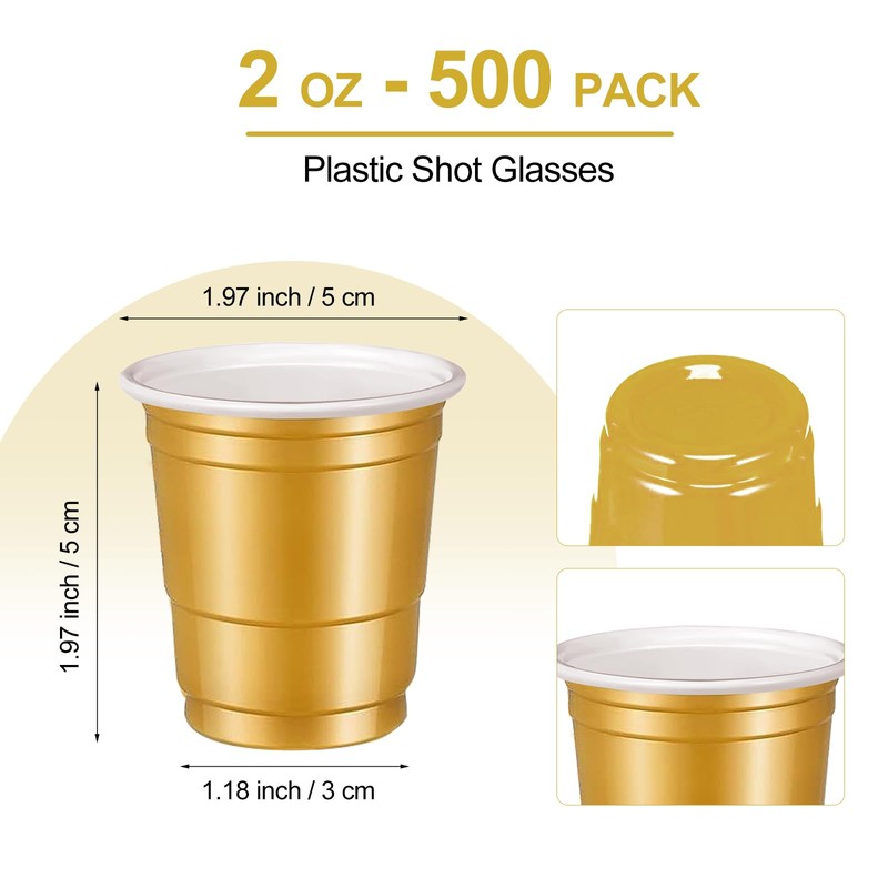 - gold Shot Glasses Disposable: our 2 oz gold party cups are about 5 cm/1.97 inches in upper diameter, about 3 cm/1.18 inches in bottom diameter and 5 cm/1.97 inches in height, and have a capacity of 2 oz.This gold plastic shot cup is stackable and no worry about it breaking like glass. These gold shot glasses are so fun for parties. People always get a good laugh from them. that you can use a sharpie to write on them so that people can keep track of their cup.