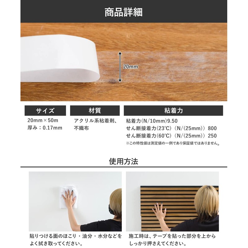 - [Features] Thick strong adhesive double sided tape with excellent olefin adhesion, resilience and shear adhesion. Adhesion: Adhesion strength (N/10 mm) 9.50 shear adhesive force (23 °C)(N/(25 mm)) 800 shear adhesive force (60 °C)(N/(25 mm)). *These characteristics are only measurements and are not guaranteed value