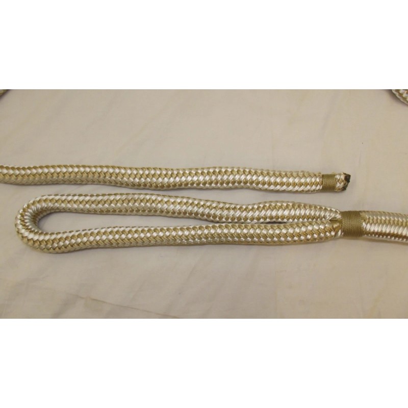 FREE SHIPPING BRAND NEW Made in the USA Pair (2) 3/4" x 25 feet (finished length) Double Braid Nylon Dock Line with 12" spliced loop If you purchase this listing you will receive 2 dock lines. This line is manufactured and custom spliced in the USA. Uses: Dock/Mooring Line, Anchor Line, Safety Line, Rigging Line, Control Lines, Tie-down rope, Utility Cord Color: Gold & White Tensile: 18,000 lbs. This is 100% Nylon Double Braid, braided nylon jacket over a braided nylon core Other colors, diameters and lengths are available--please contact.