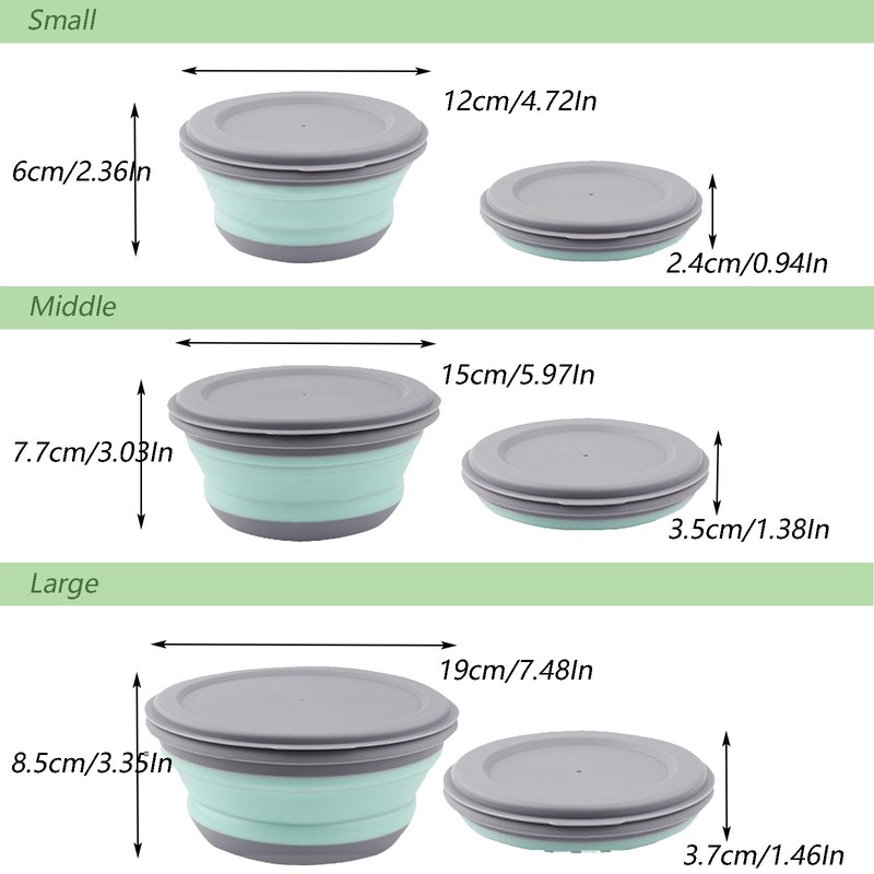 - MIXED SIZE Reusable collapsible bowls in 3 mixed sizes are great for camping, lunch boxes for kids and food leftovers.