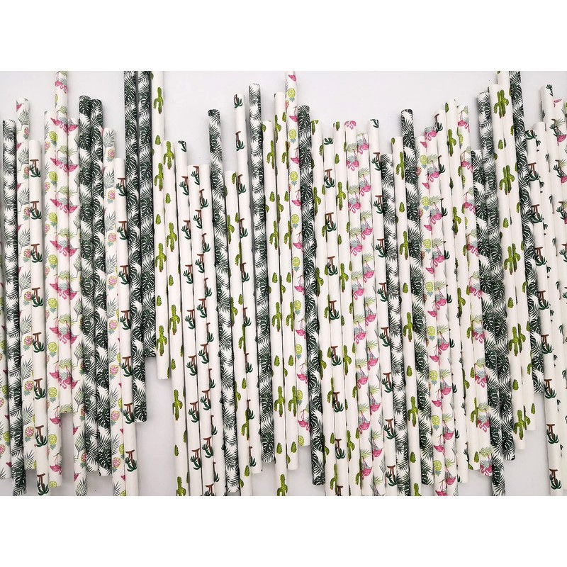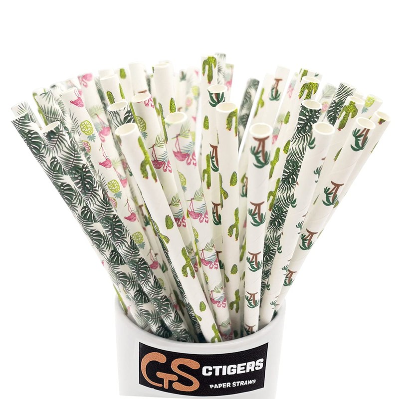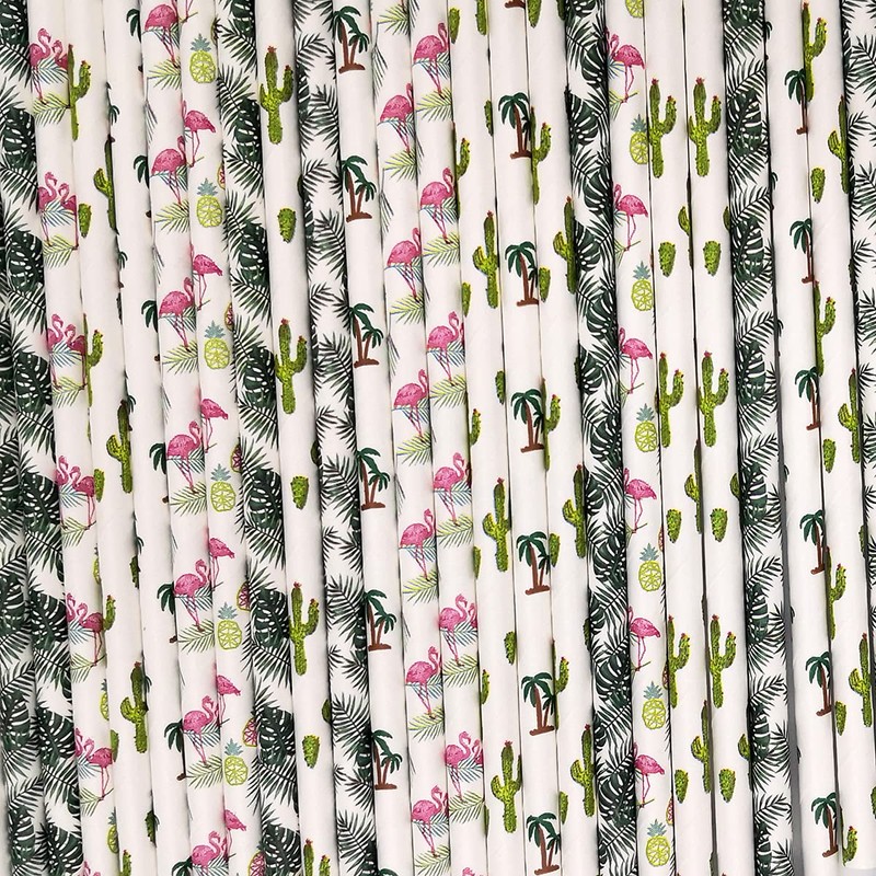 CTIGERS Hawaiian Tropical Paper Straws for Summmer Party Beach Cocktail Flamingo Pineapple Cactus Coconut Tree 4 Color Mixed Biodegradable Drinking Straws Box of 100