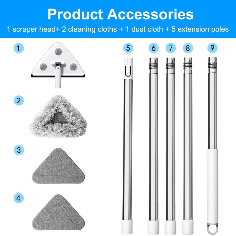 - 3-in-1 Professional Window Cleaning Kit Our window cleaning kit combines cleaning, squeegeeing, and dusting into one versatile product. It includes a 14-inch cleaning head with a scraper bar, a 5-section extension pole, and 2 cleaning cloths and 1 dusting cloth, simplifying your home cleaning tasks with just one tool.