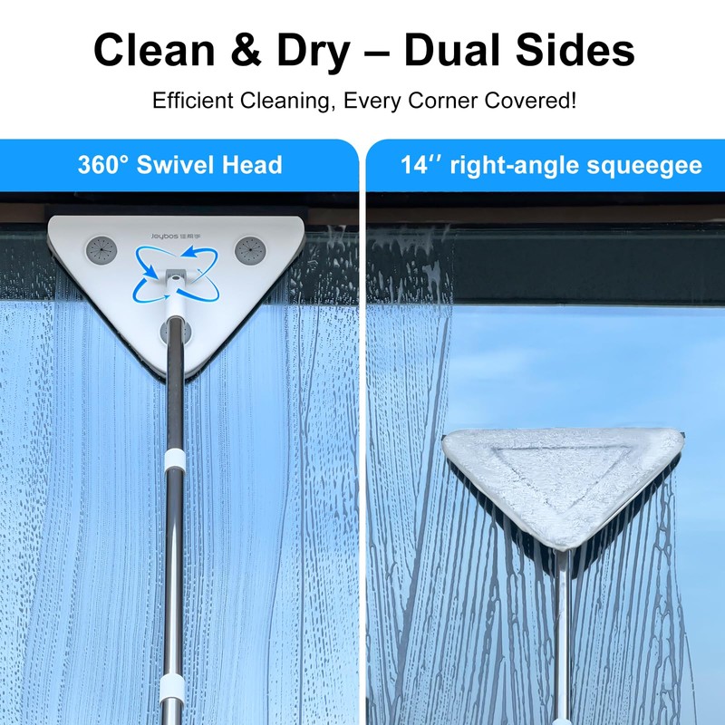 - Clean Without Blind Spots Equipped with a uniquely designed triangular cleaning pad and a 360-degree rotating head, this window cleaning tool reaches into corners and crevices, ensuring thorough cleaning without leaving any spots. Say goodbye to hard-to-reach dirt!