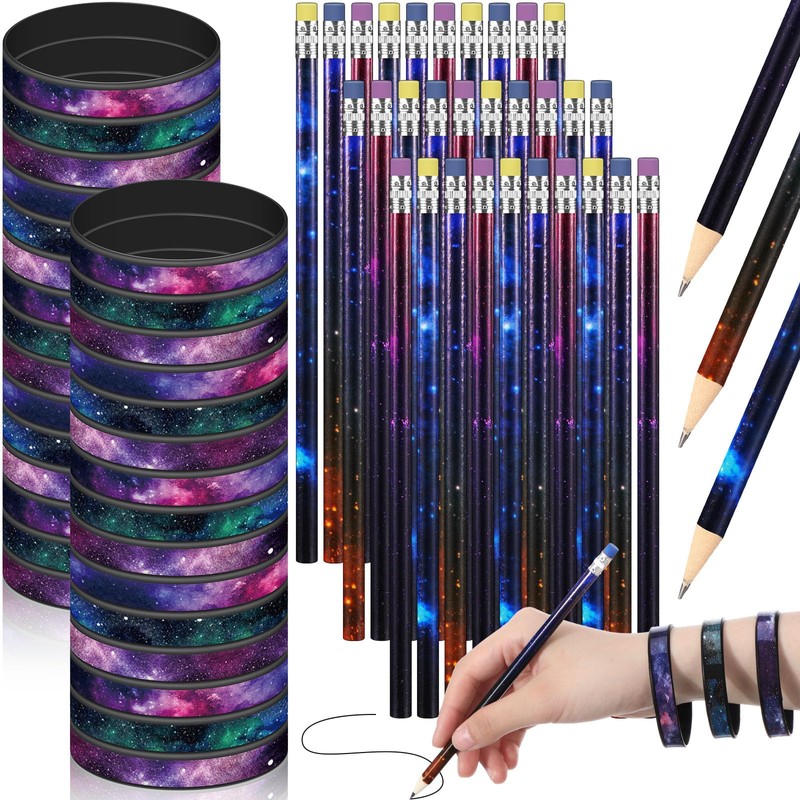 Ctosree 60 Pcs Galaxy Star Pencils Space Silicone Bracelets Set Outer Starry Sky Party Favor Pencils with Eraser Rubber Wristbands Bulk for School Office Supplies Student Reward Astronomy Party Favor