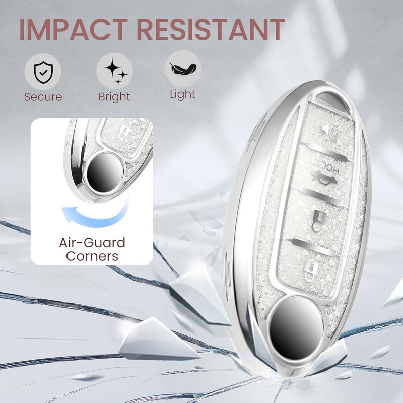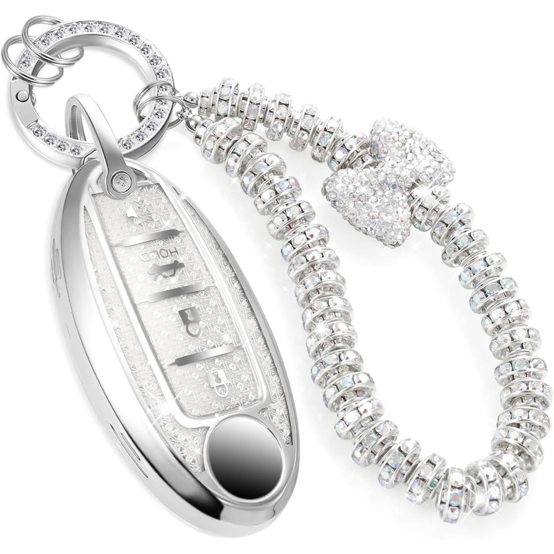 CTRINEWS for Nissan Key Fob Cover with Fashionable Zirconia Wristlet KeyChain, Enchanting Diamond Patterns Soft Case for Murano Pathfinder Rogue Titan Versa (4 Button) (White, B)