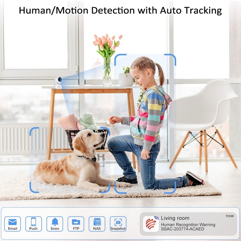 - 2.4/5 GHz WiFi and person/motion detection with automatic tracking: This wireless indoor surveillance camera with 5 dB antenna supports dual band 2.4 and 5 GHz WiFi, which provide a stronger signal and faster transmission. This indoor IP camera detects people only under humanoid detection and detects all moving targets under motion detection (such as people and pets). When the detection is triggered, it captures the target and automatically tracks movements.