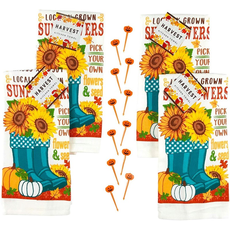 • COMPLETE SET INCLUDES: Four (4) Printed Kitchen Towels. Complimentary plastic pumpkin food picks (12 count) included.