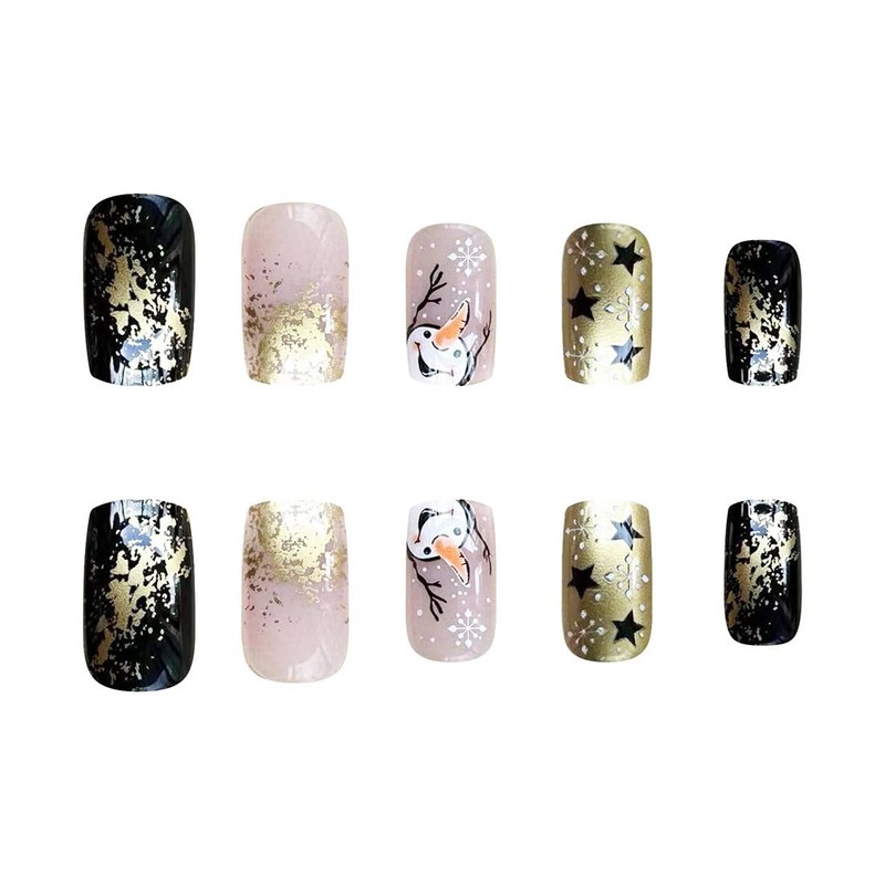 Cubahop Pack of 24 Christmas Nails, Short Square Fake Nails, Red Elk, Forest, Snowflakes, False Nails, Snowman, Gold Foil, Glitter Press on Nails for Women and Girls (C)
