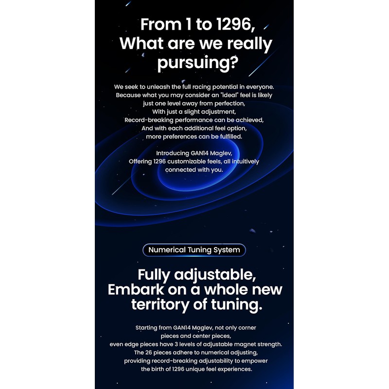 - ✅1296 Posibilidades: el GAN 14 MagLev no solo se detiene a velocidad y suavidad; ofrece hasta 1296 sensaciones personalizables. Con sus ajustes totalmente ajustables, embarque en un innovador viaje de afinación de cubos. Sumérgete profundamente y descubre ese entorno perfecto diseñado solo para ti