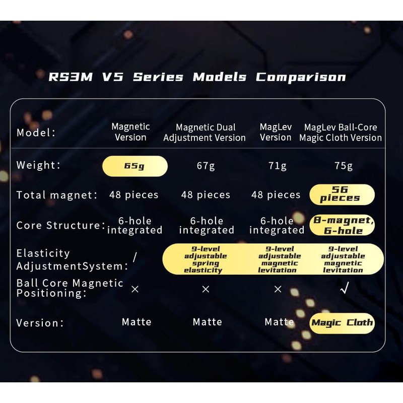 - ✅ Posicionamiento magnético preciso: con 48 imanes estratégicamente posicionados, el RS3M V5 promete una experiencia de resolución estable y controlada. Siente la diferencia en cada giro y deja que el posicionamiento magnético preciso te guíe a tu próximo mejor nivel personal. MAGNÉTICA MAGNÉTICA!! !