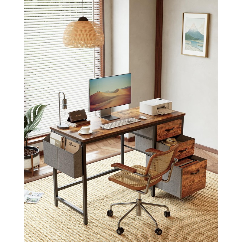 - 【Smart Storage, Less Clutter】 Tired of hunting for your pens, papers, and sanity? This desk with drawers has your back—with two fabric drawers, a roomy file cabinet, and a side storage bag ready to store whatever you toss in (we won't judge). Work smarter, not messier.