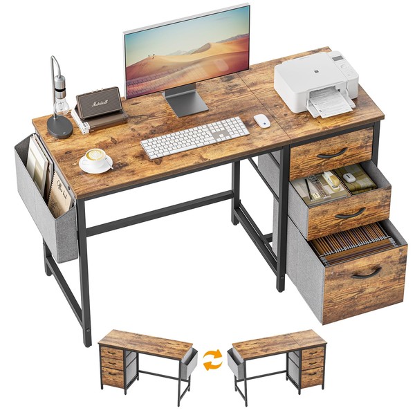 CubiCubi 47 Inch Computer Desk with Drawers and File Cabinet, Home Office Desks with Side Storage Bag, Workstation with Reversible Design, Writing Table with Modern Style, Brown