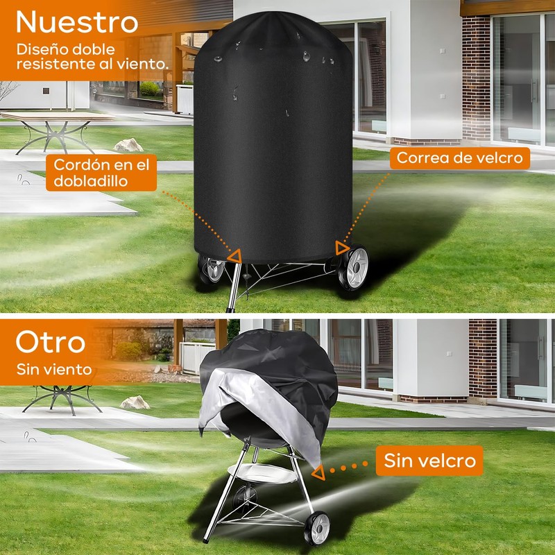 - 【Cordón Ajustable de Velcro y Dobladillo】:Probado en la práctica, incluso con fuertes vientos y lluvia intensa, el cordón de velcro y dobladillo elástico trabajan juntos para proporcionar una excelente resistencia al viento y a la lluvia, haciendo que la cubierta de la barbacoa esté bien envuelta. en su parrilla al aire libre, sin que el viento se lo lleve.