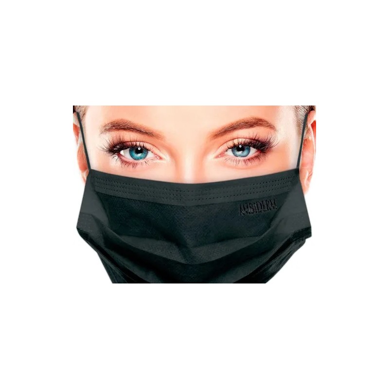 Caja con 50 unidades de mascarillas quirúrgicas de tres capas con filtro antibacteriano, confeccionadas con material no tejido en color negro. Cuentan con una eficiencia de filtración bacteriana (BFE) mayor o igual a 98%.