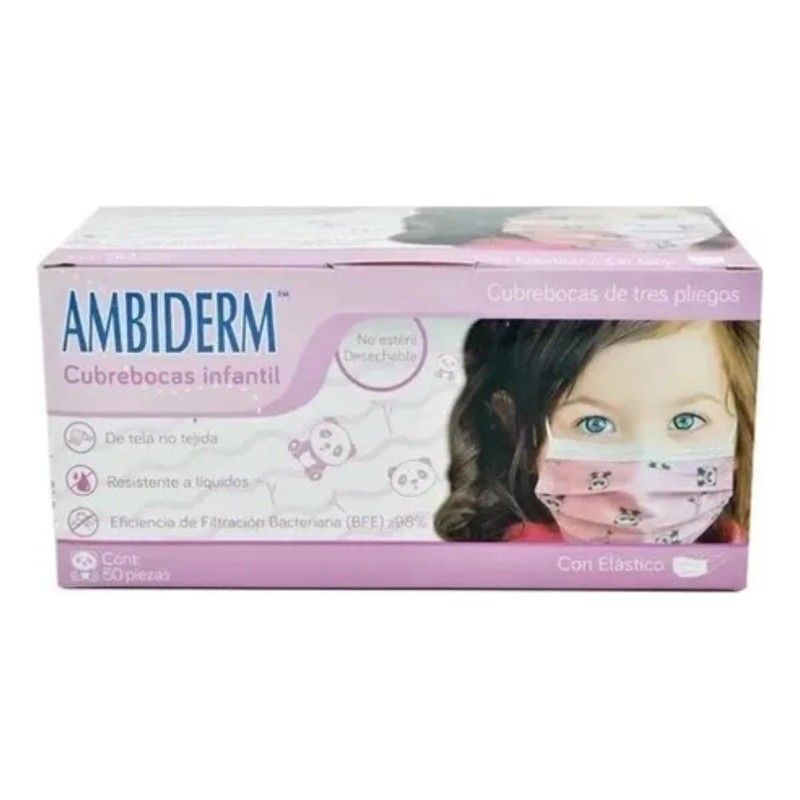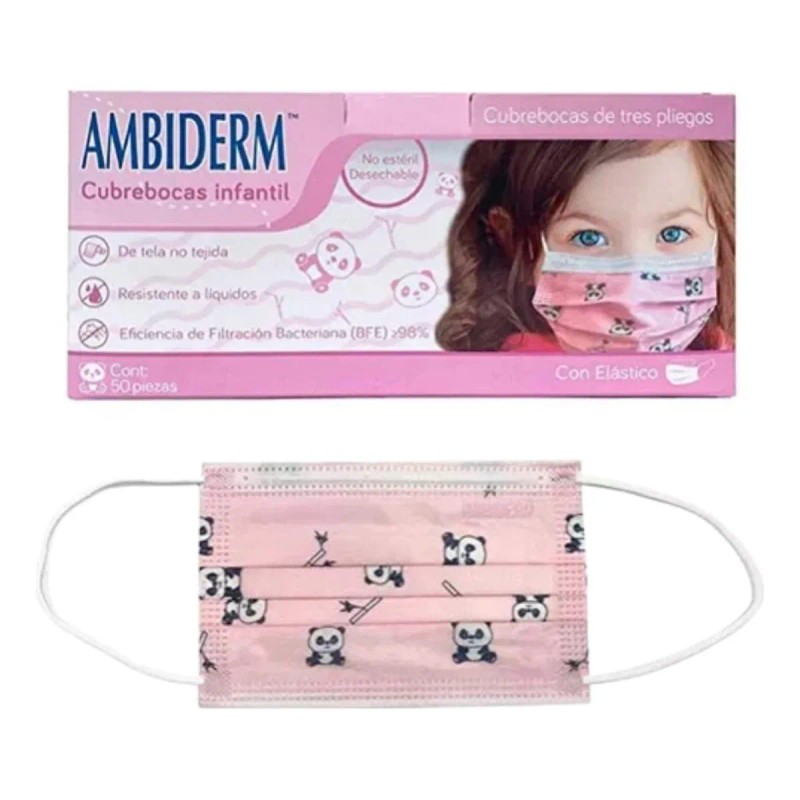 Cubrebocas Infantil Tricapa Rosa Con Pandas Ambiderm 50pzs Color Rosa Claro
