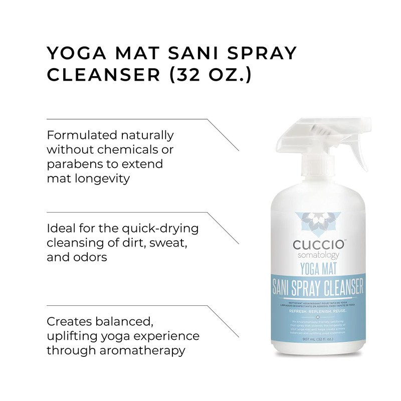 - UNIQUE, NATURAL DISINFECTANT FORMULA; An integral part of the Cuccio Cleansing Ritual, the Sani Spray is a quick-cleansing, refreshing spray that instantly wipes away oils, dirt, sweat, and odor while improving the overall smell of your yoga mat.