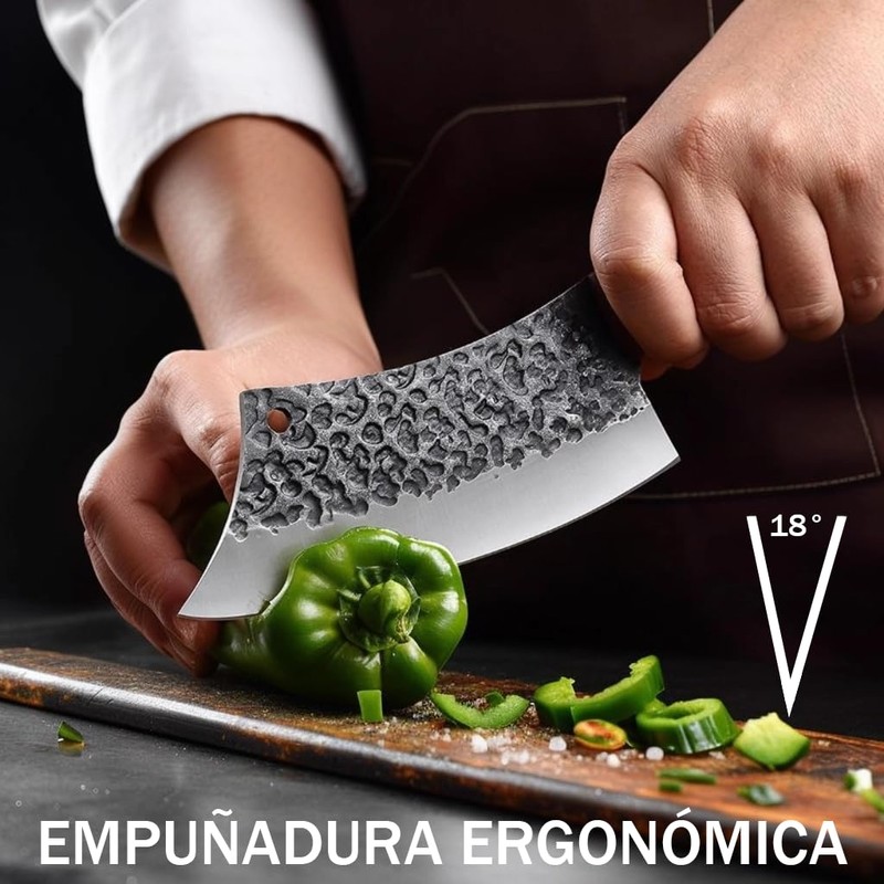 • 【RENDIMIENTO DE COCINA PROFESIONAL】La hoja afilada con precisión a 18° pica sin esfuerzo carnes, verduras y hierbas, y la hoja de 5 mm de grosor se enfrenta a tareas difíciles como partir las articulaciones de las aves.