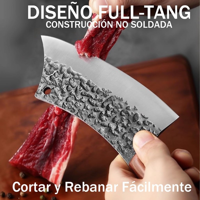 • 【ConstrucciónFULL-TANG】 Todo el cuchillo de chef es una construcción FULL-TANG de una sola pieza que facilita cortar filetes, rebanar tubérculos o preparar caza mientras acampa, picar y cortar huesos.
