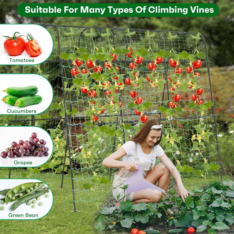 • Wide Application: This garden trellis supports a variety of vegetables, including cucumbers, peas, zucchini, beans, grapevines, tomatoes, dragon fruit, flowers, pumpkins, melons, and other climbing plants. It's perfect for gardens and yards, helping you optimize your gardening area.
